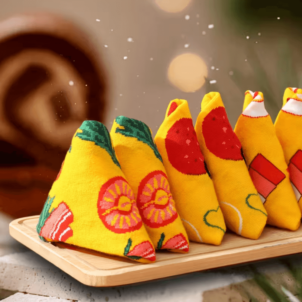 3 pár sárga zokni, pizzaszeletnek összehajtogatva